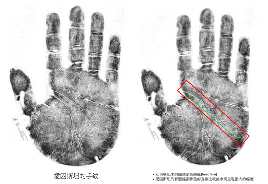 怎麼知道自己有沒有熱情的好奇心呢?拿一把尺看一下自己的智慧線(head line) 如果是直線代表您是個非常實際且目標導向的個性; 但是如果智慧線有幅度, 恭喜您了!代表您具有了基本的好奇心~ (如下圖:愛因斯坦有幅度的智慧線)